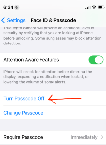 Go to Settings > Face ID & Passcode (or Touch ID & Passcode) > (scroll down) > Turn Passcode Off