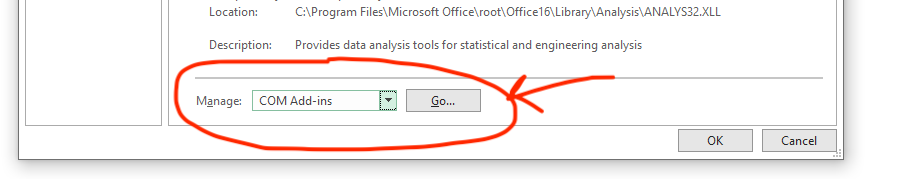 Step 2: Next, under “Manage:”, select COM Add-ins and click Go…