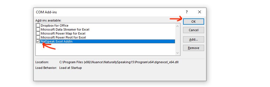 Step 3: Select the NatSpeak Excel Addin checkbox and click OK.